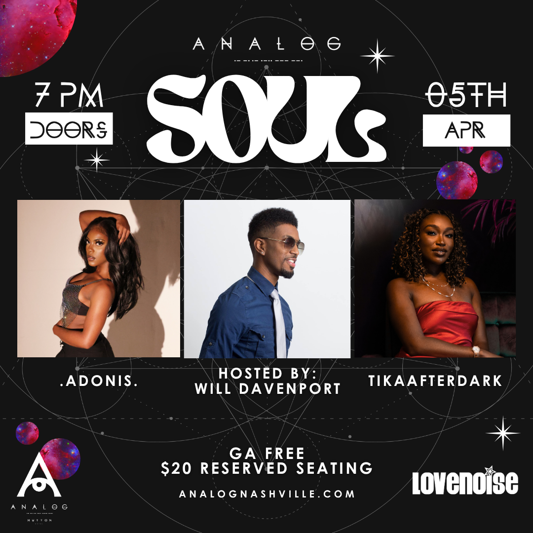 Elevate your week with Analog Soul, the ultimate show where the heartbeat of local and regional talent is showcased. Whether you’re a connoisseur of smooth grooves or a fan of soulful melodies, our weekly show promises a rich tapestry of sound that will keep you coming back for more. Curated by Nashville’s own Lovenoise, the series highlights the city’s growing R&B and soul community while bringing together standout artists, DJs, and performers in one of the most intimate listening rooms in Music City. From head-nodding classics to forward-thinking new sounds, Lovenoise shapes each night to create a true music-lover’s experience. Come feel the soul of Nashville through carefully crafted performances that celebrate both legacy and the next generation of talent.